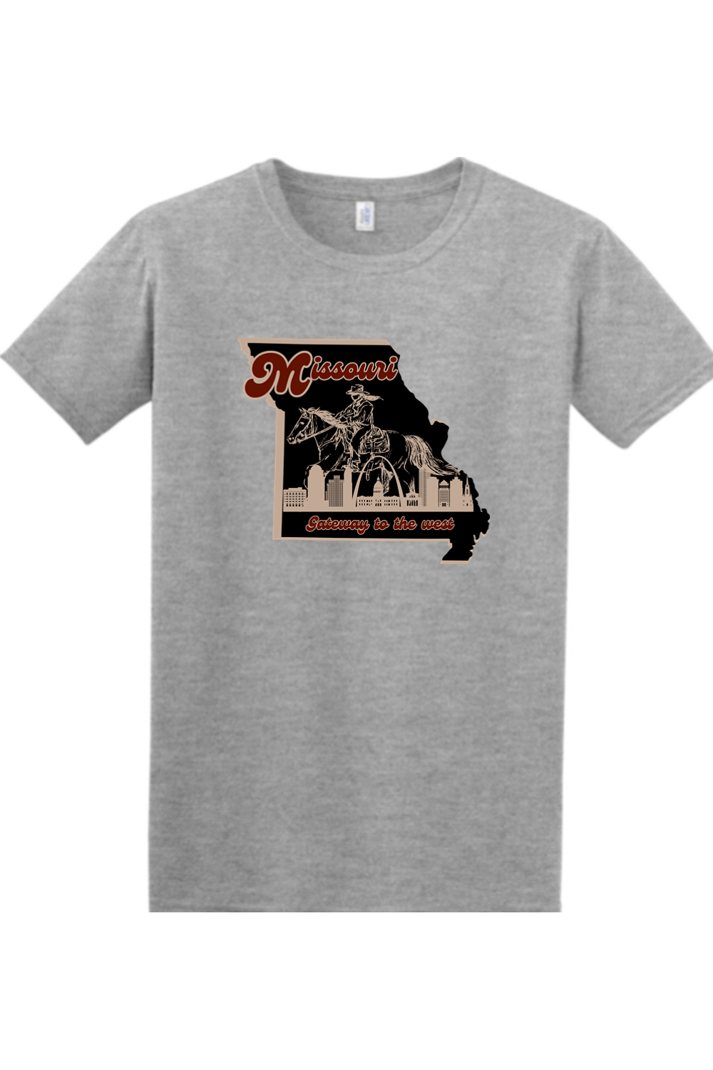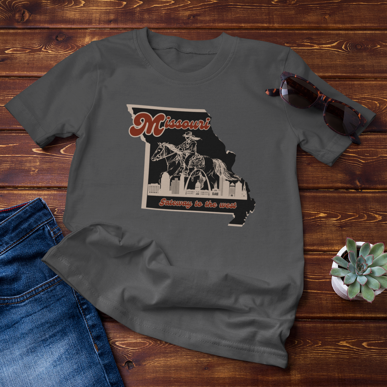 Step into comfort and heritage with our Missouri Gateway to the West Tee. Crafted from premium ringspun cotton, this shirt is buttery soft, lightweight, and built to last—making it your go-to for long days in the saddle or laid-back nights by the fire. Designed with durability in mind, it holds its shape wash after wash, while the bold Western graphic honors Missouri’s legacy as the Gateway to the West. Whether you’re hauling to a rodeo or kicking back on the weekend, this tee is made for every mile of the journey.